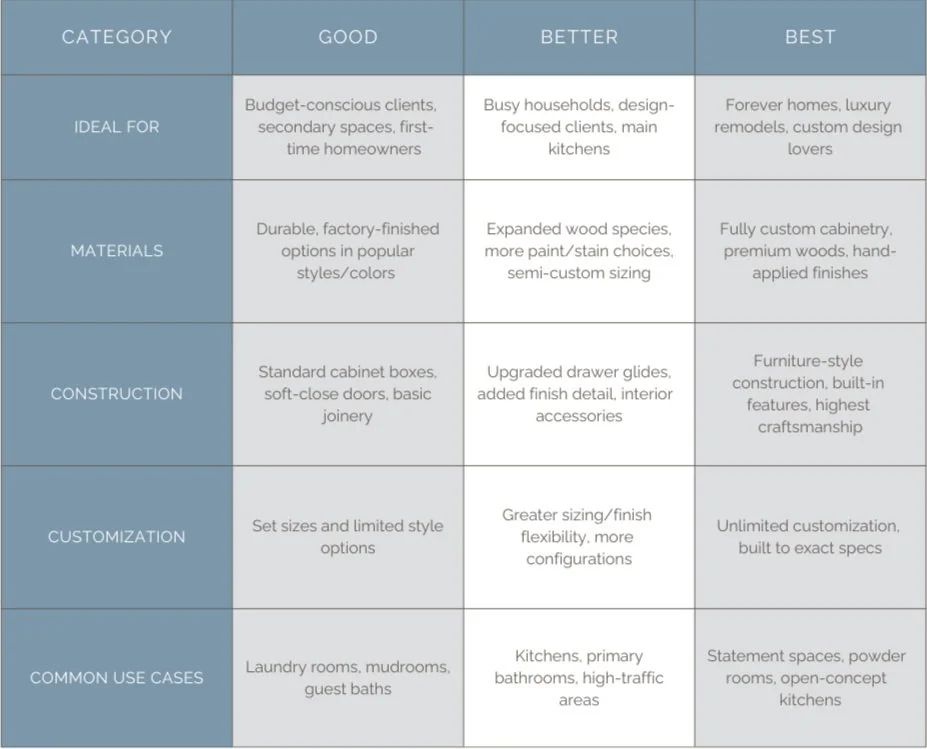 Think of it as a tiered approach to cabinetry that helps you understand what you're getting at each level, without any guesswork. Our Good, Better & Best approach helps you invest with intention. By identifying the areas where premium cabinetry matters most, and where simpler solutions will do just fine, you can: