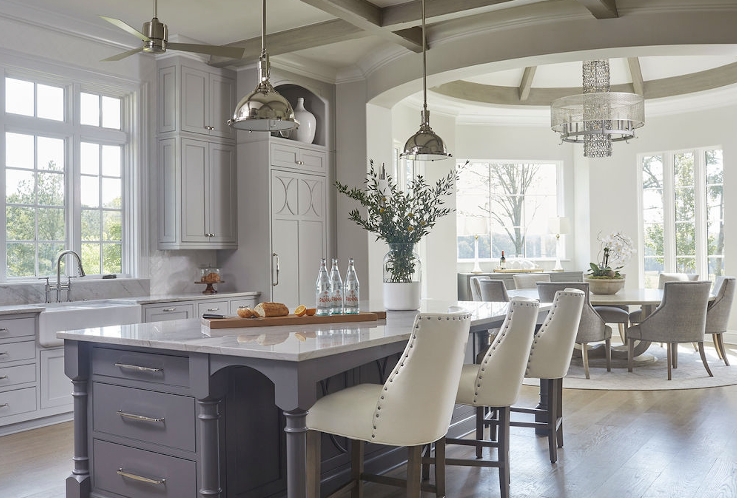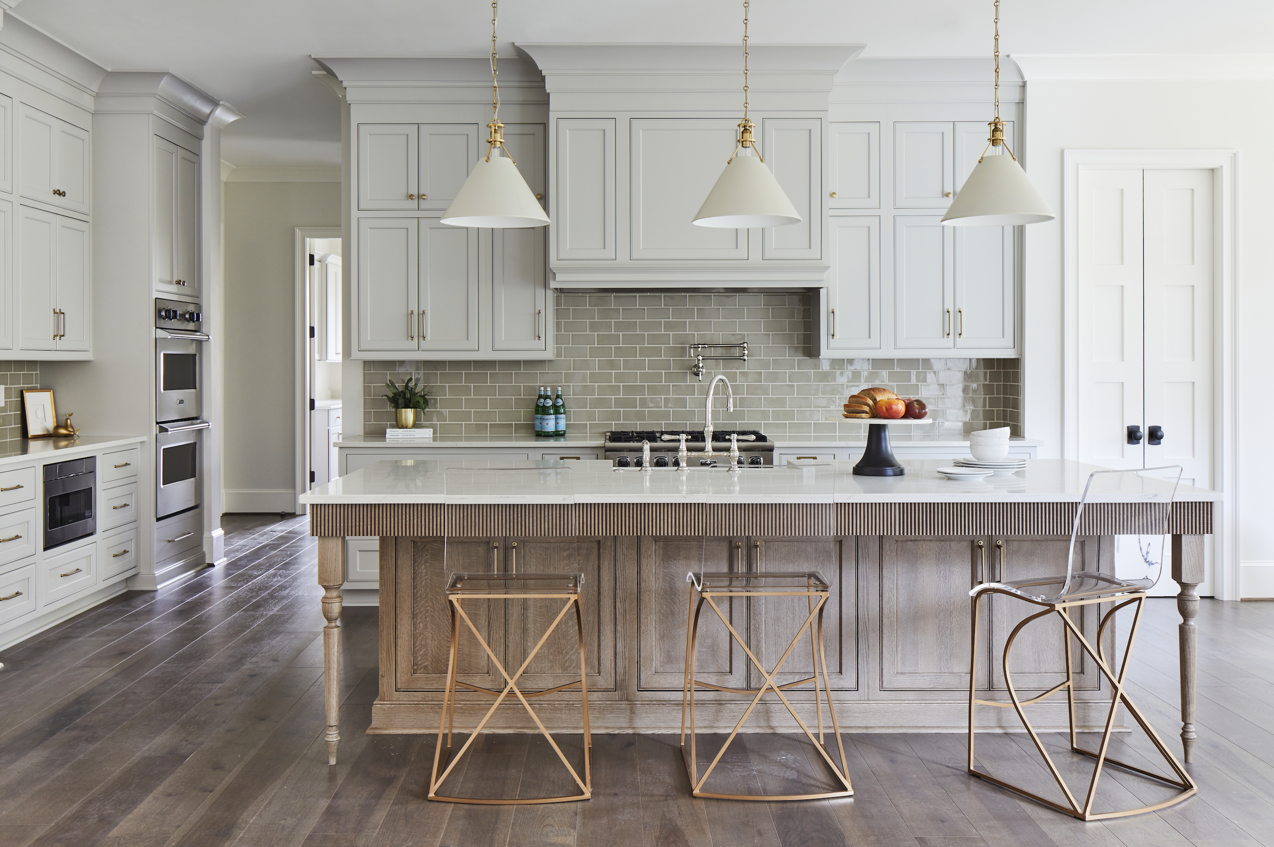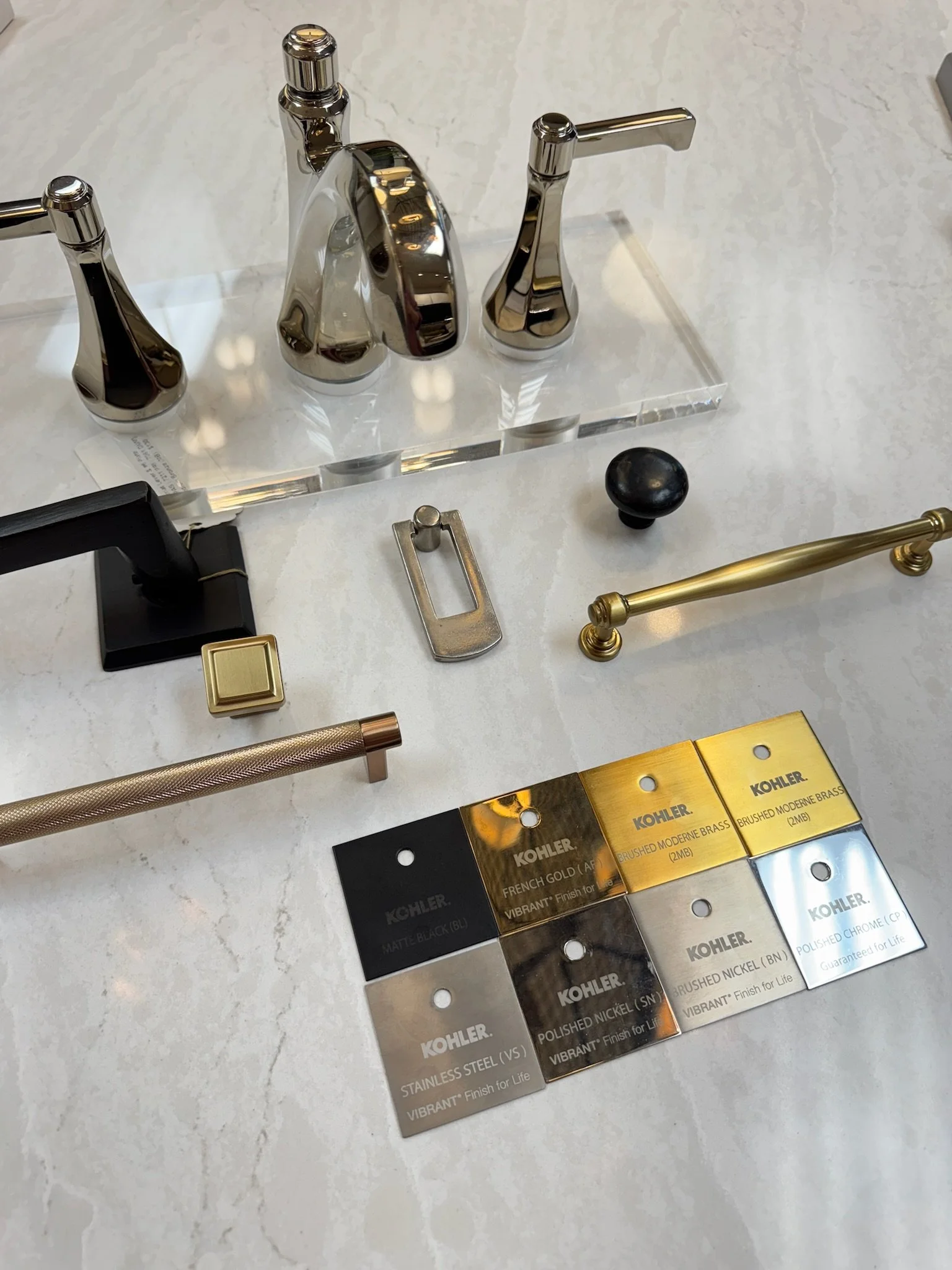 Start with a primary finish—usually cabinetry—then layer in complementary elements like hardware, lighting, and accents.