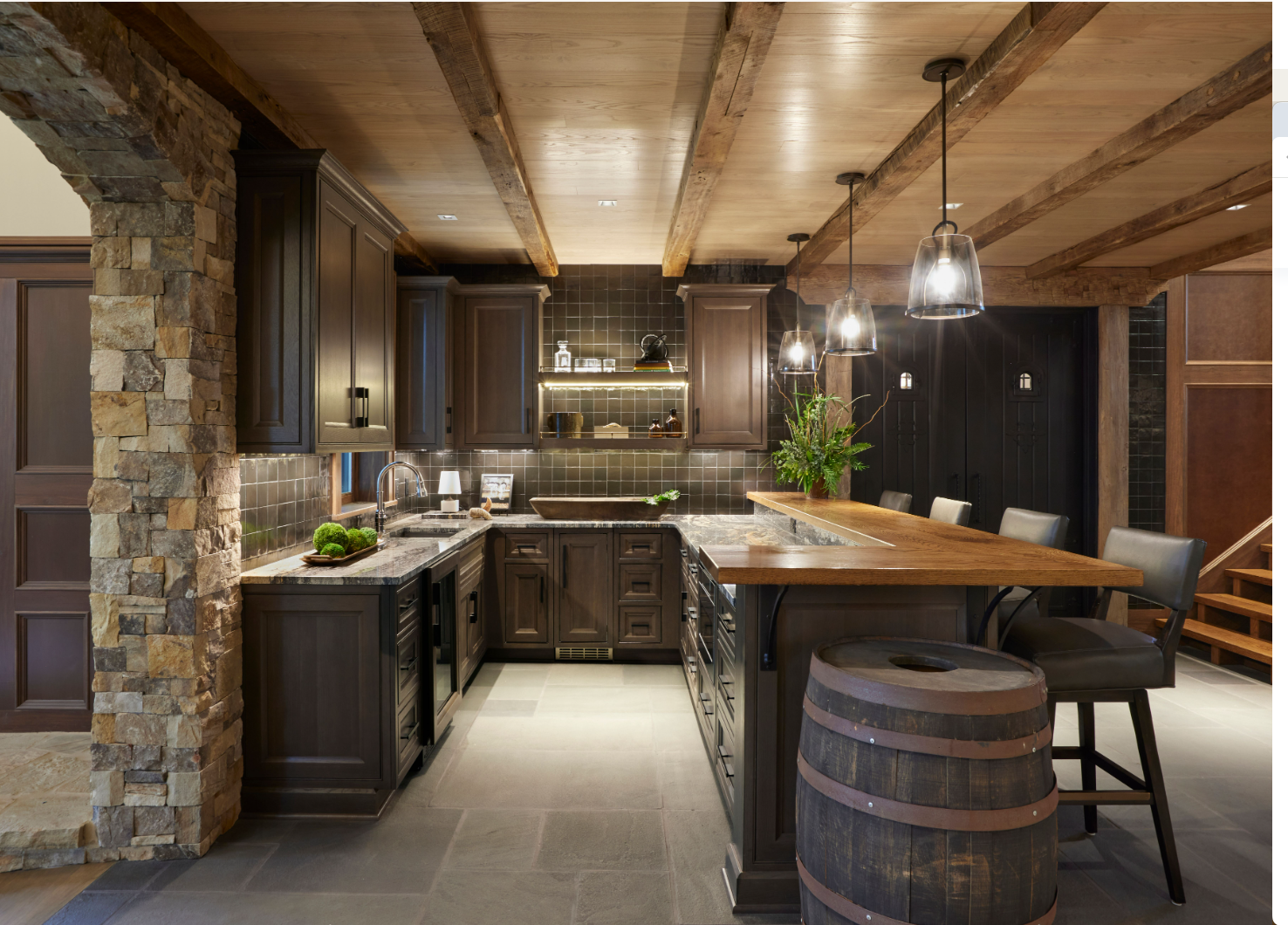 Stained island paired with reconstituted veneer cabinetry on the perimeter
