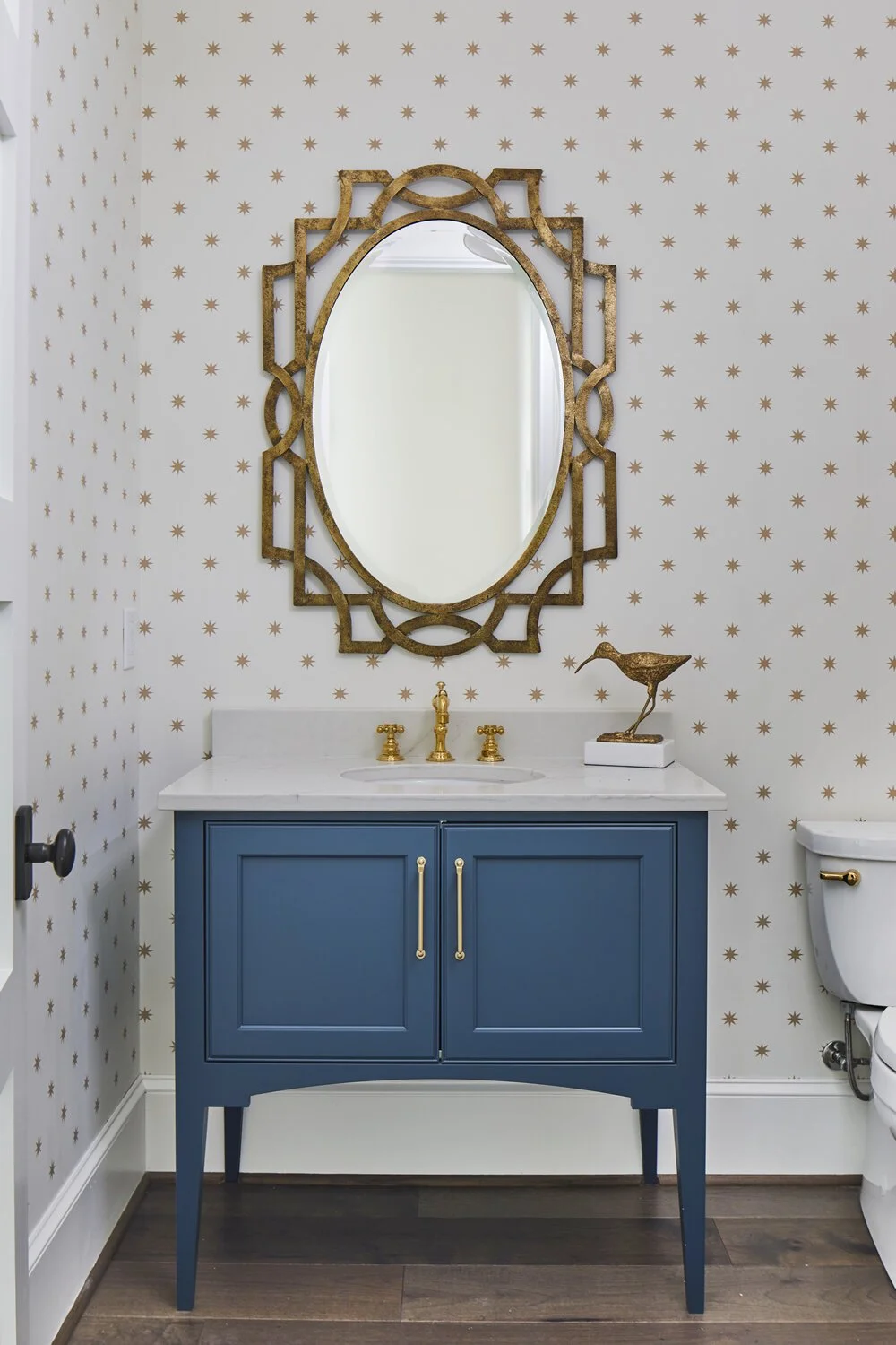 A furniture-style vanity adorned with Shiloh Cabinetry in Benjamin Moore Newburg Green sets a rich tone. An unlacquered brass faucet from Newport Brass and a stunning Uttermost vanity mirror complement the sophisticated Schumacher Wallpaper, creating an inviting yet opulent space. This room is a perfect blend of classic charm and modern luxury, making it a standout feature of the home.