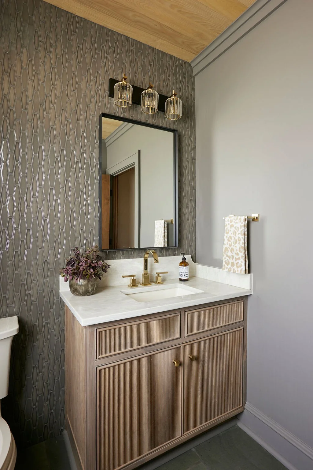 The custom walnut vanity features elegant reeded detailing and rich wood tones that elevate the compact space while tying into the overall lodge aesthetic.